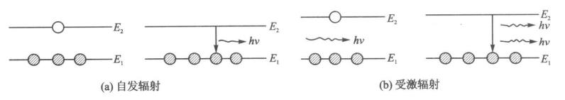 如果处于高能级的原子在外界作用影响下,发射光子跃迁到低能级上去,这种发光叫做原子的受激辐射。设原子有能量为E1和E2的两个能级,而且E2>E1。当原子处于E2能级上时,在能量为hv=E2-E1,(h为普郎克常数,h=6.626×10-34J•S,v为光的频率)的人射光子影响下,这个原子可发生受激辐射,跃迁到E1能级上去,并发射出一个能量为hv=E2-E1的光子,如下图(b)所示。在受激辐射过程中,发射光子不仅在能量上(或频率上)与人射光子相同,它们在相位、振动方向和发射方向上也完全一样。如果这些光子再引起其他原子发生受激辐射,这些原子所发射的光子在相位、发射方向、振动方向和频率上也都和最初引起受激辐射的人射光子相同,如下图(a)所示。这样,在一个入射光子影响下,会引起大量原子的受激辐射,它们所发射的光子在相位、发射方向、振动方向和频率上都完全一样,这一过程也称光放大。所以在受激发射时,原子的发光过程不再是互不相关的,而是相互联系的。这种光就是激光。
