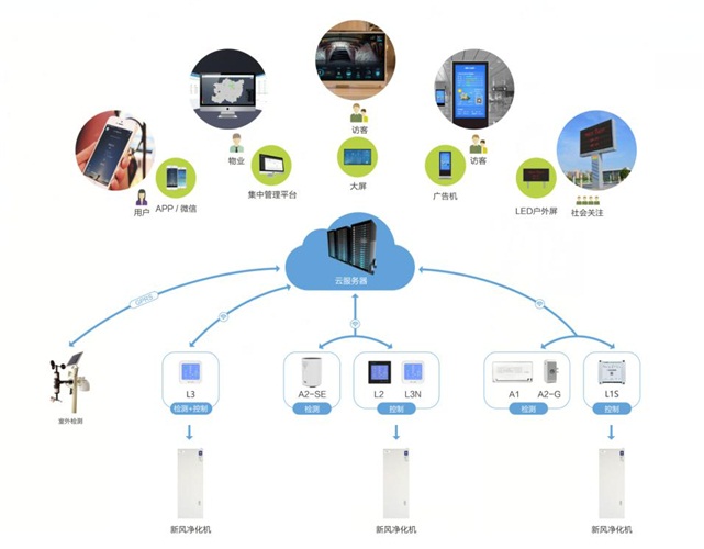 智慧楼宇环境综合系统解决方案是由空气质量检测仪和控制治理设备及综合监管平台共同组成,空气电台感知设备(智能空气质量检测仪)感知到空气中污染物的浓度,通过 APP 进行数据信息通知提醒或通过RS485总线进行数据查询,与控制类产品(L1S,L2,L3N)联动启动相关的联动环境设备(如新风机、空气净化器、空调暖通设备、加除湿设备、增氧机、负离子发生器等),改善当前环境,达到预设状态。