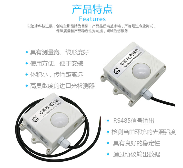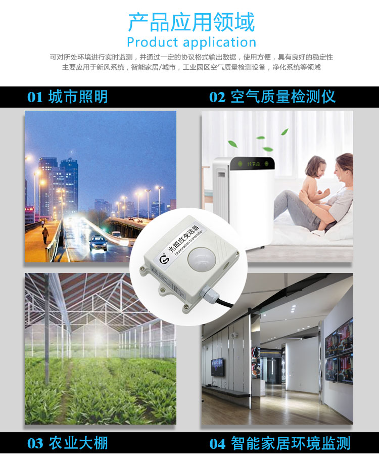 这款光照度变送器,为RS485输出,对弱光也有较高的灵敏度,测量范围宽、线形度好、防水性能好、使用方便、便于安装、传输距离远等特点,适用于各种场所,尤其适用于农业大棚、农业气象、城市照明等场所。根据不同的测量场所,配合不同的量程,线性度好、防水性能好、可靠性高、结构美观、安装使用方便、抗干扰能力强。