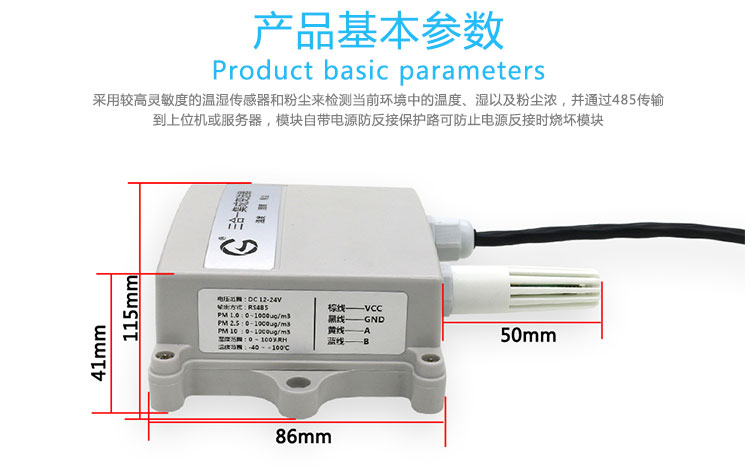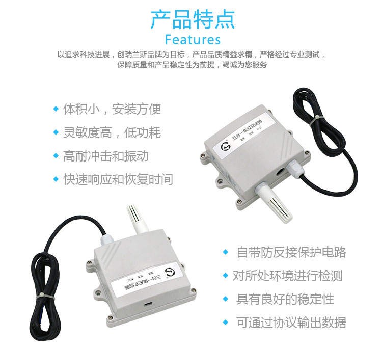 这款温湿度激光粉尘三合一集成变送器,采用高灵敏度的温湿度传感器和粉尘传感器来检测当前环境中的温度、湿度、粉尘浓度,并通过485传输到上位机或服务器,该温湿度粉尘集成变送器自带电源防反接保护电路,可防止电源反接时烧坏变送器。集湿度传感器,湿度传感器,激光粉尘传感器为一体,使用方便,应用广泛,如:电子、制药、空调净化、食品卫生、医院、大型车站,农业,畜牧业等等。厂家直销,自主研发。