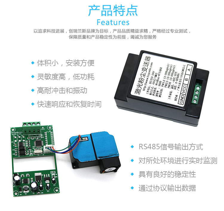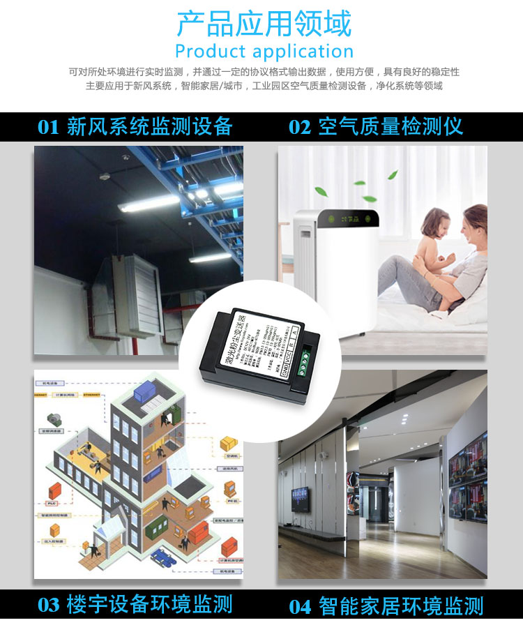 本产品采用较高灵敏度的激光型粉尘传感器,其有测量精度特别高,使用方便,便于安装,体积小传输距离远等特点。应用于电子、制药、空调净化、食品卫生、医院、空气清新等领域。