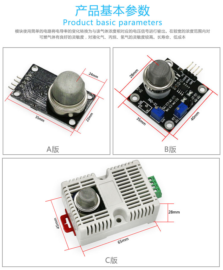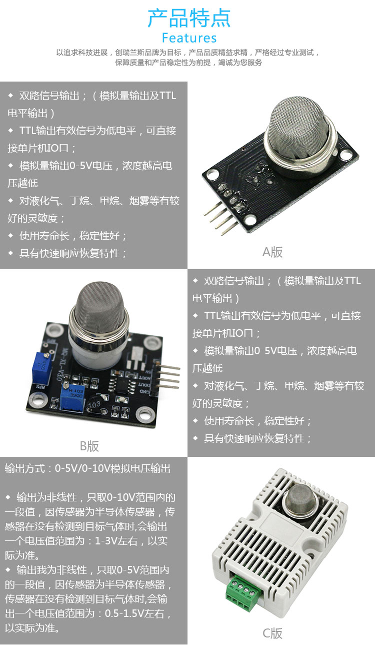 这款MQ-2可烟雾传感器模块使用简单的电路将电导率的变化转换为与访气体浓度相对应的电压信号进行输出,在较宽的浓度范围内对可燃气体有很好的灵敏度,对液化气、丙烷、氢气的灵敏度较高,稳定性好,检测范围广,使用寿命长,成本低,是一款高性价比的烟雾传感器模块。主要应用于:家庭用气体泄漏报警器、工业用可燃气体报警器和便携式气体检测器,以及其他气体易泄漏监测等场合,适宜于烟雾、甲烷、丁烷气体等监测装置。