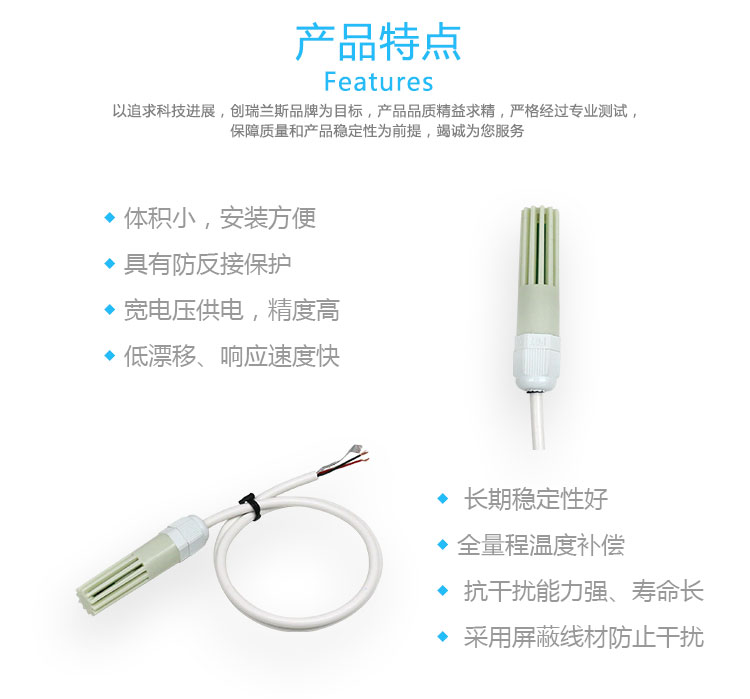这款RS485输出的湿湿度变送器,使用进口芯片,集成高精度湿度传感器,湿度传感器,软件设置地址,无需拆外壳,不易损坏,使用寿命长。长期稳定性好、全量程温度补偿;宽电压供电,精度高;低漂移、响应速度快;抗干扰能力强;具有防返接保护;采用带有屏蔽纸的专用数据传输线材来防止干扰。是一款高品质高性价比的温湿度变送器。